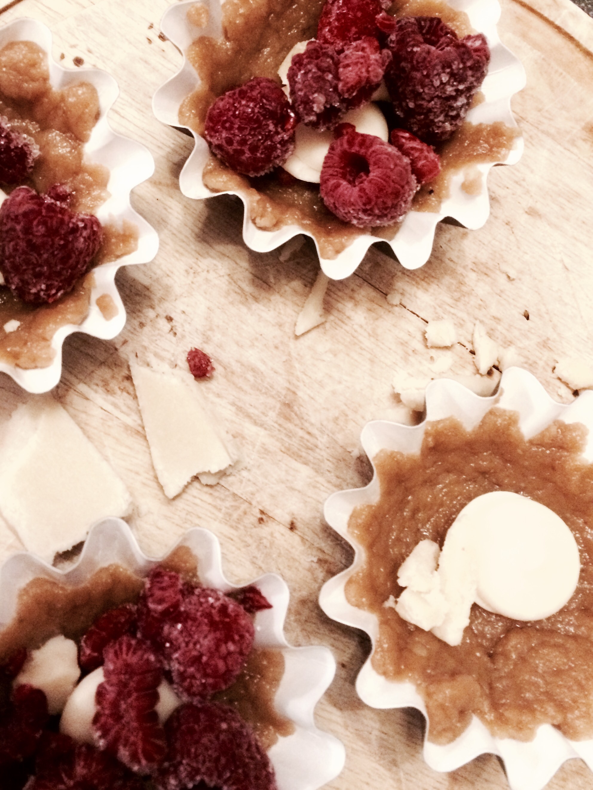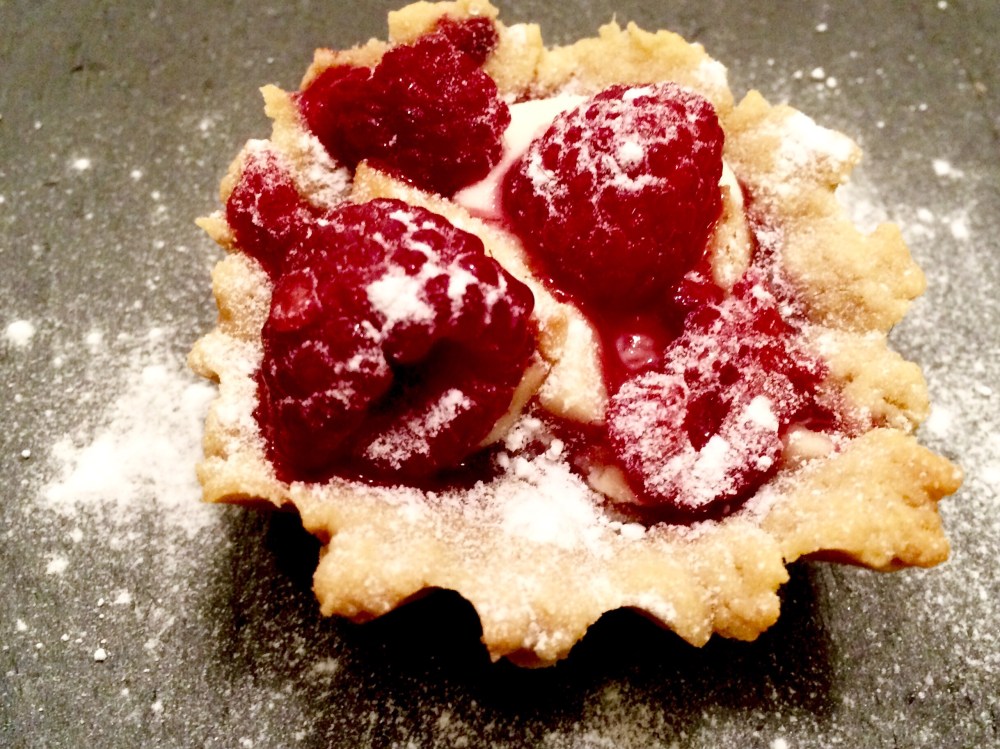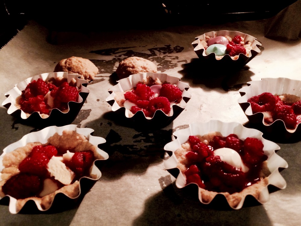 - In small tartelettes shapes, spread the dough evenly, then add some white chocolate & bits of marzipan, add a few raspberries on top & leave to cook for 15 minutes on the lower rack