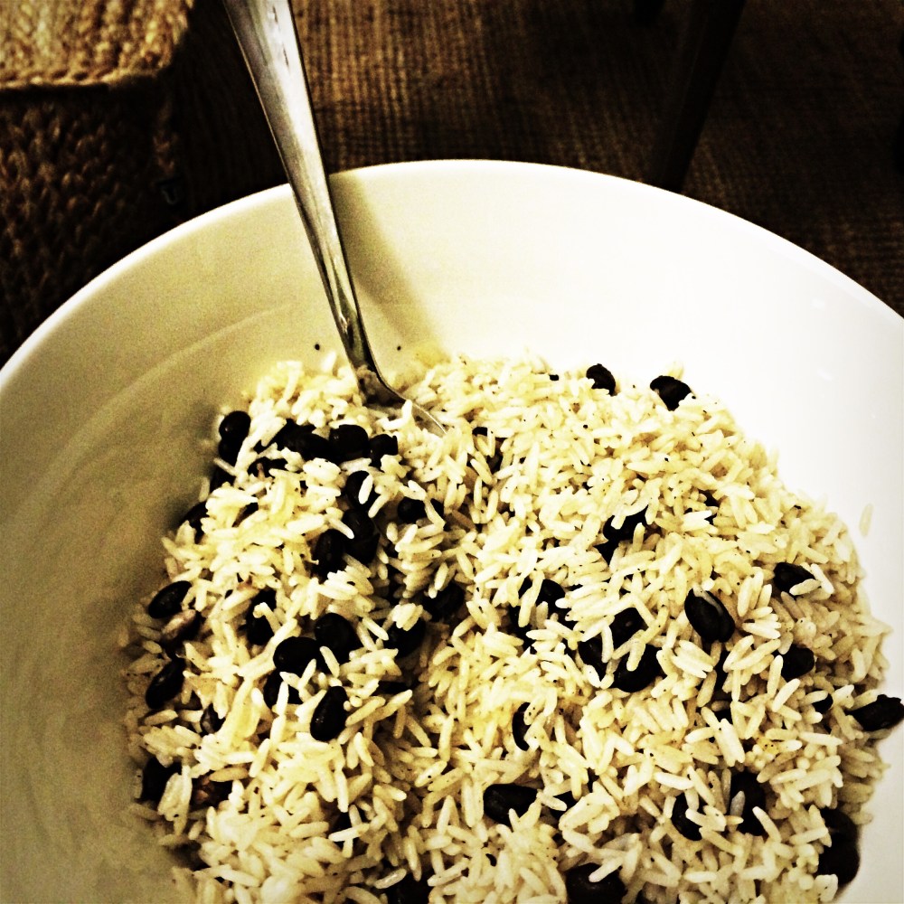 For the rice & bean, you can either use already cooked black beans from the store, or if you have time, I would recommend you spend it letting these dark beauties simmer for an hour at medium low heat with a peeled onion in salted boiling water! You can then combine them with your cooked white rice and season with garlic, cumin; black pepper & salt.