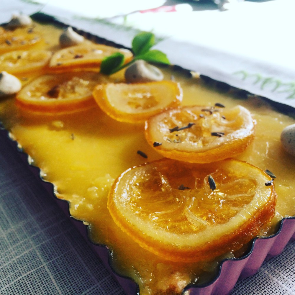 Lavender Lemon Tart with candied lemons, Lingonberries & Thyme