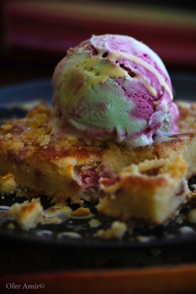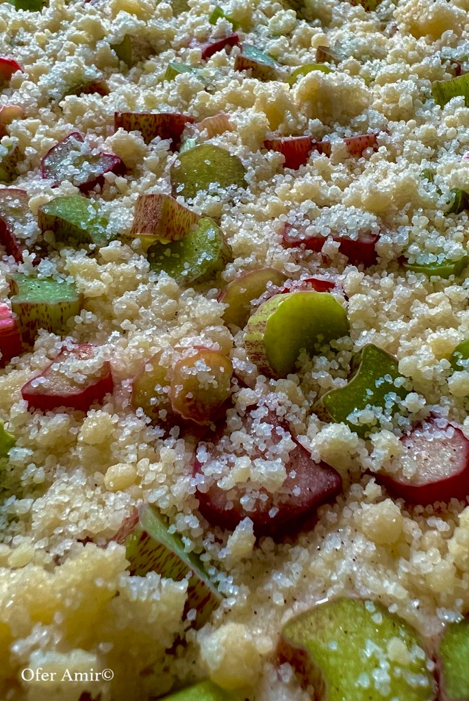 Pure into a round 22 buttered pie plate and spread the rhubarb pieces on top.