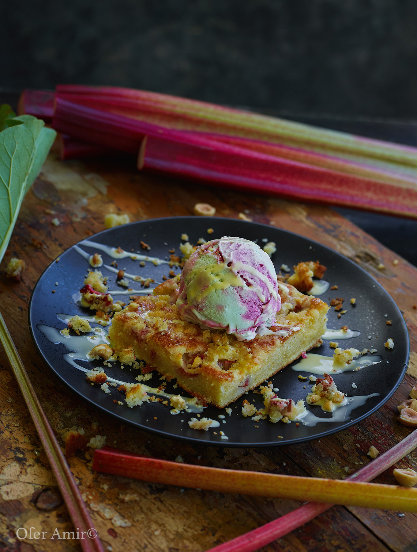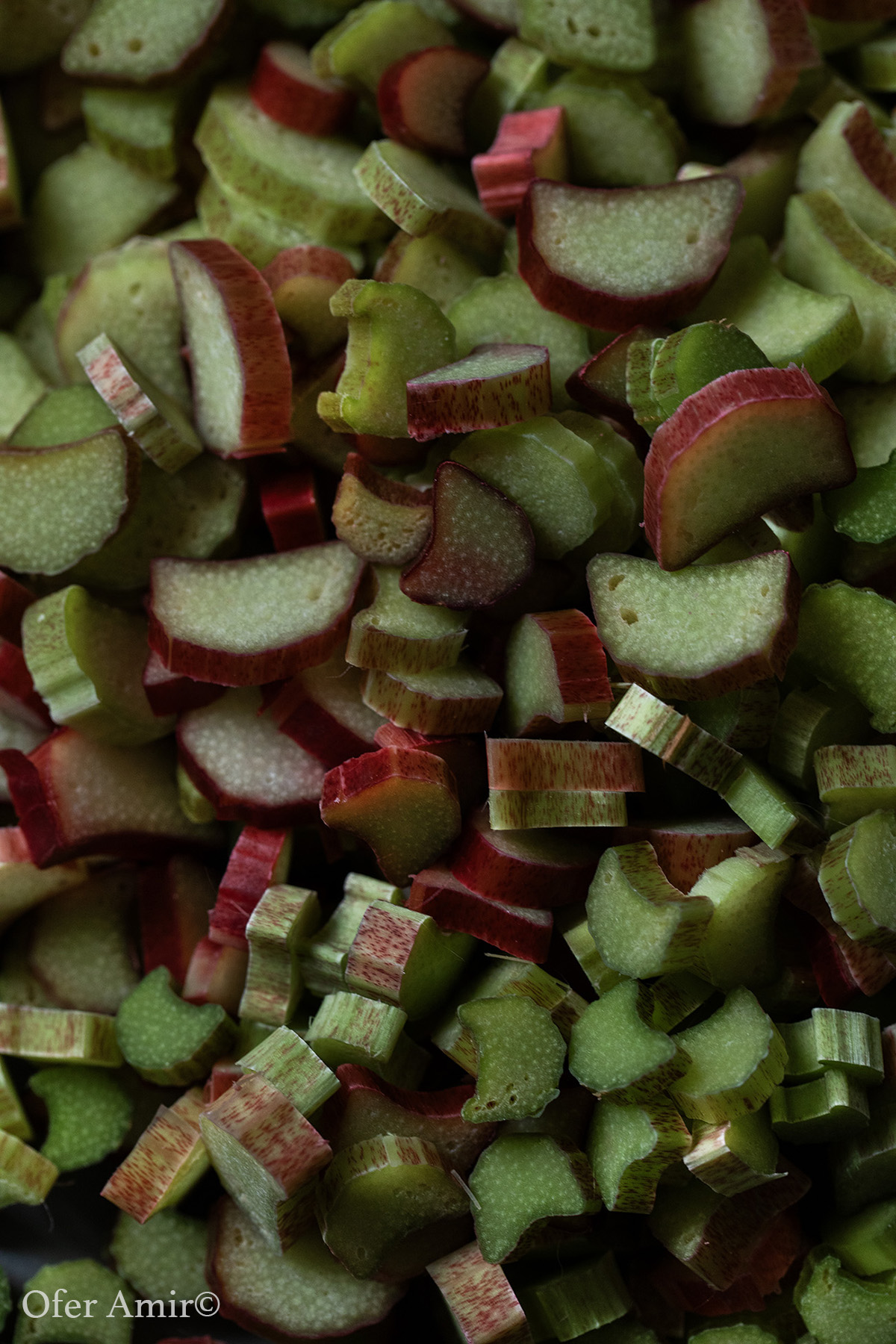 Pure into a round 22 buttered pie plate and spread the rhubarb pieces on top.